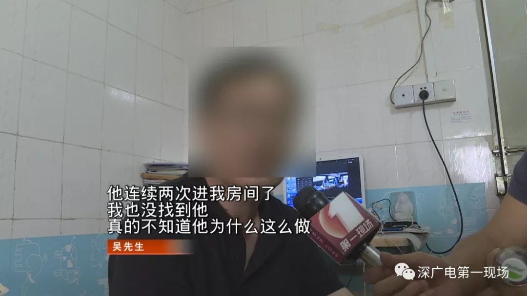 被驚醒的吳先生發(fā)現(xiàn)后,男子在7點(diǎn)19分離開吳先生房間。看到這兩段監(jiān)控,吳先生有點(diǎn)后怕。