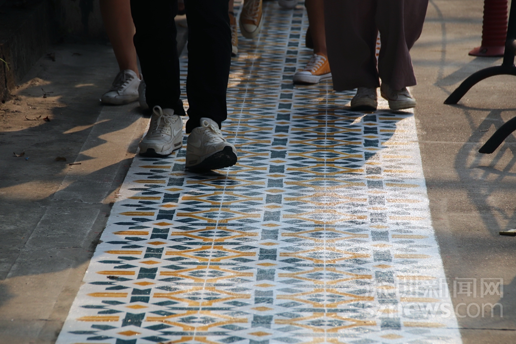 志愿者在協(xié)助創(chuàng)作《安全地帶》花磚涂鴉作品(主辦方供圖)