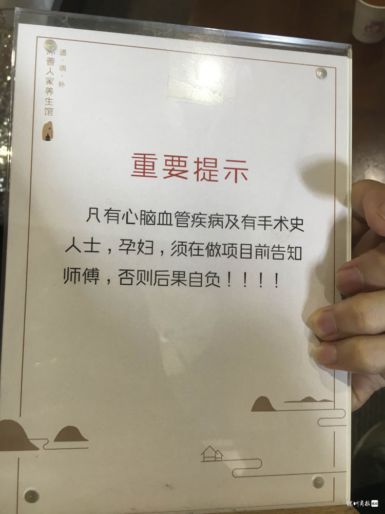 5月22日,讀創(chuàng) /深圳商報記者來到了該養(yǎng)生館,該養(yǎng)生館仍在正常營業(yè)。記者發(fā)現(xiàn),店家在桌子上擺放了重要提示:凡有心腦血管疾病及有手術史人士、孕婦,須在做項目前告知師傅,否則后果自負!李小姐告訴記者,這是她母親出事后才增加的,正骨等項目已被店家從美團上撤下。