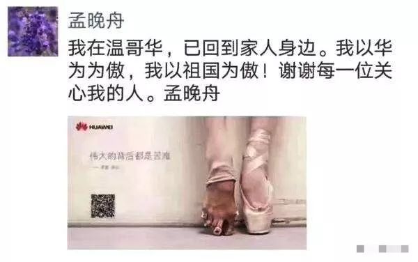 當(dāng)?shù)貢r間2018年12月1日,加拿大當(dāng)局應(yīng)美方要求,扣留了在加拿大機(jī)場轉(zhuǎn)機(jī)的孟晚舟,美國隨后承認(rèn),正在尋求對孟晚舟的引渡。10天之后,2018年12月11日,加拿大法院作出裁決,批準(zhǔn)孟晚舟的保釋申請。當(dāng)晚,走出法庭的孟晚舟發(fā)朋友圈表示,我以華為為傲,我以祖國為傲。配圖就是那張“芭蕾腳”的華為廣告圖,上面寫著:偉大的背后都是苦難。外界擔(dān)心,由于不斷升級的中美貿(mào)易摩擦,可能會影響到孟晚舟在加拿大的引渡訴訟。