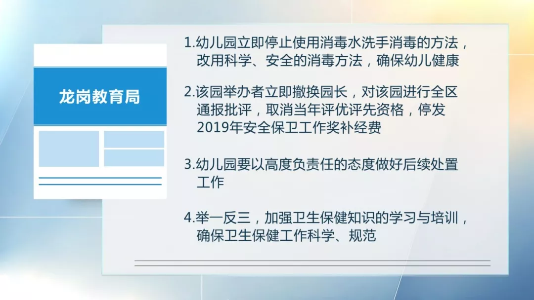 5月24日,龍崗區(qū)教育局了解到該情況后,立即派工作人員到幼兒園進(jìn)行調(diào)查。經(jīng)查,該園出現(xiàn)“皰疹性咽頰炎”后,違規(guī)使用強(qiáng)力消毒粉兌水給幼兒洗手消毒,存在衛(wèi)生保健上嚴(yán)重錯誤。
