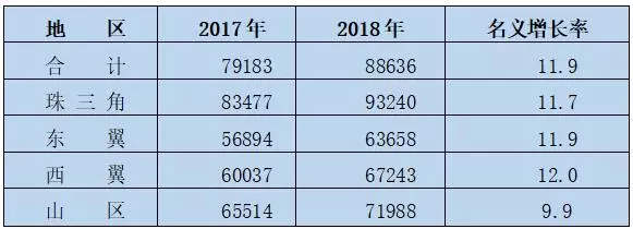 分地區(qū)看,工資最高的仍是珠三角,以城鎮(zhèn)私營單位為例,珠三角、東翼、山區(qū)和西翼分別為60919元、46793元、42764元和42632元。不過,同比名義增長最高的卻是山區(qū),達(dá)11.3%,隨后珠三角同比名義增長為8.5%、東翼為8.4%、西翼為7.7%。數(shù)據(jù)還顯示,最高和最低區(qū)域的平均工資之比為1.43,比上年縮小0.03。