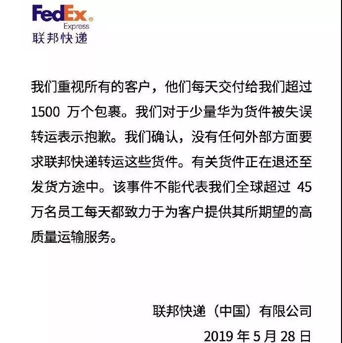 聯(lián)邦快遞(中國(guó))公司28日在其社交媒體官方賬號(hào)稱,“我們對(duì)于少量華為貨件被失誤轉(zhuǎn)運(yùn)表示抱歉。我們確認(rèn),沒(méi)有任何外部方面要求聯(lián)邦快遞轉(zhuǎn)運(yùn)這些貨件。有關(guān)貨件正在退還至發(fā)貨方途中?!?/p>