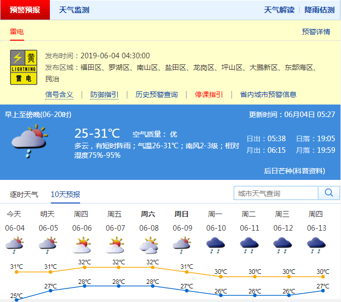 深圳新聞網(wǎng)2019年6月4日訊 近期深圳市(含深汕)頻繁強降雨過程4日起暫歇。6月4日氣溫25-31℃,多云,有短時陣雨;氣溫26-31℃;南風2-3級;相對濕度75%-95%。