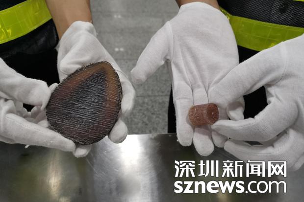 5月13日,一名30歲左右的男性旅客自福田口岸旅檢大廳入境,海關關員發(fā)現(xiàn)該男子行李不多,手里拎著一個塑料袋,神情有些緊張,有意躲避海關檢查,便將其列為挑查對象。經(jīng)檢查,關員在當事人攜帶的塑料袋內(nèi)查獲疑似犀牛角制品。