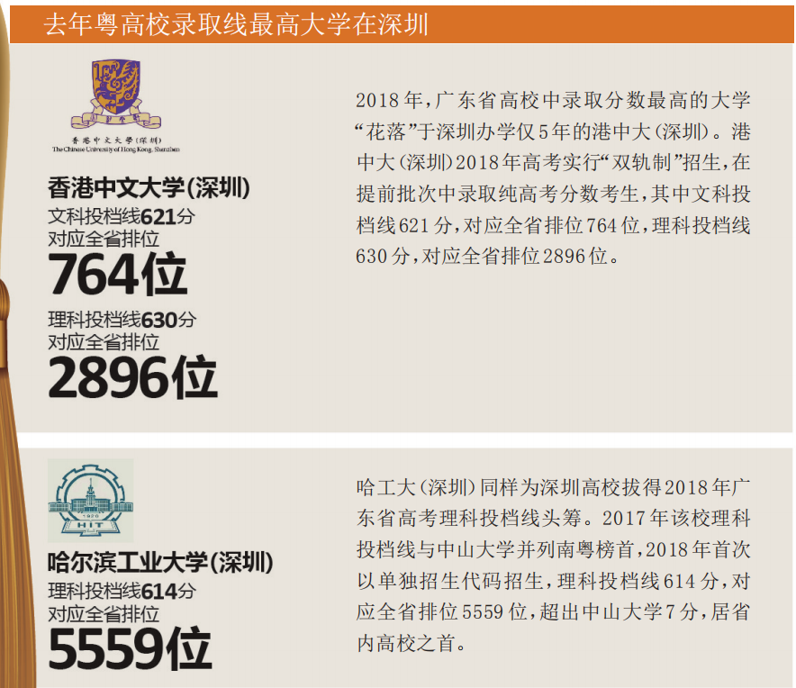 2018年,廣東省高校中錄取分?jǐn)?shù)最高的大學(xué)“花落”于深圳辦學(xué)僅5年的港中大(深圳)。港中大(深圳)2018年高考實行“雙軌制”招生,在提前批次中錄取純高考分?jǐn)?shù)考生,其中文科投檔線621分,對應(yīng)全省排位764位,理科投檔線630分,對應(yīng)全省排位2896位。