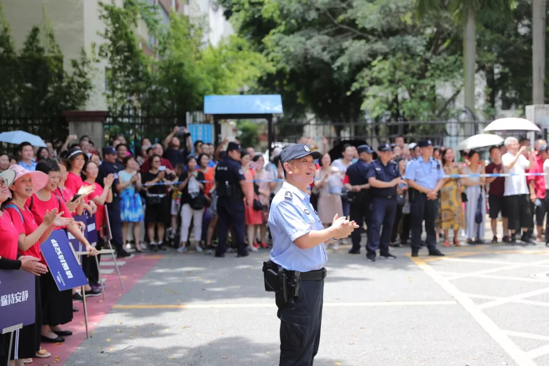 △當(dāng)?shù)谝晃豢忌叱錾钲趯嶒瀸W(xué)校中學(xué)部考場時,通心嶺派出所所長林志強與現(xiàn)場家長為其鼓掌喝彩。