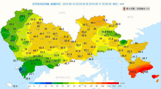圖說:11日深圳全市日降雨量(單位:毫米,截止至11日16時05分)