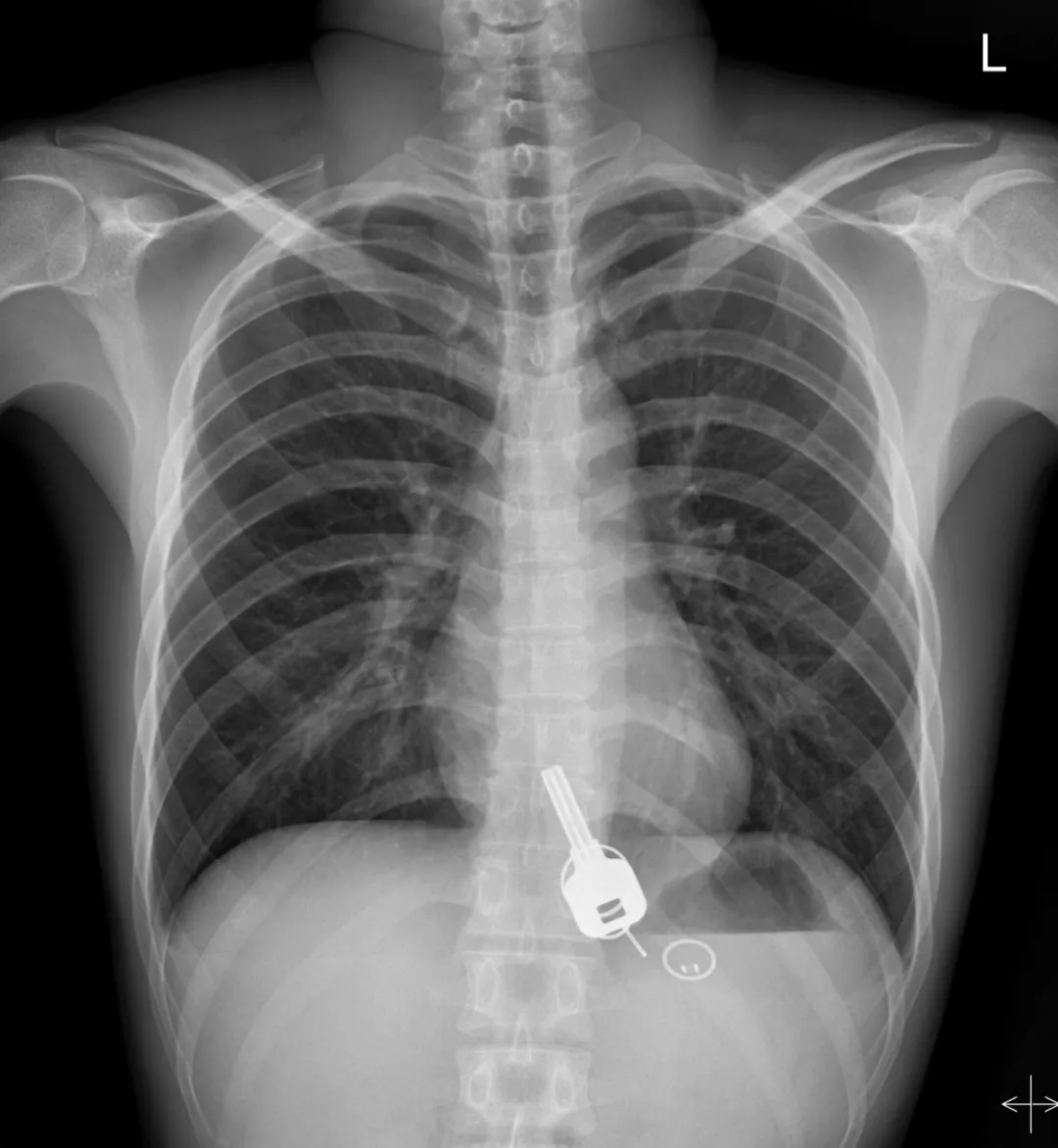 廣東東莞的常先生酒后回家找不到鑰匙,酒醒后他感到胸口疼痛,去醫(yī)院一查,發(fā)現(xiàn)一把鐵鑰匙、2個鑰匙扣、1個門禁牌清楚顯示在肚子胃區(qū)的位置上。
