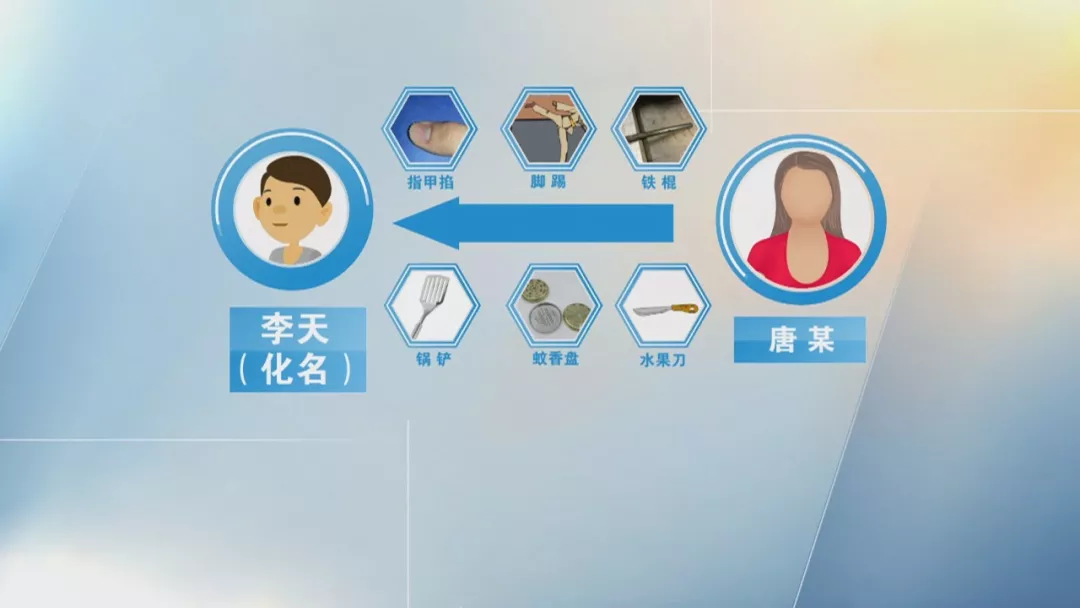 5月30號,唐某以李天洗碗沒洗干凈為由,用金屬漏勺抽打其手臂背部及頭部,導(dǎo)致李天頭部嚴(yán)重出血,后經(jīng)鑒定為輕微傷。
