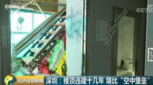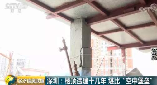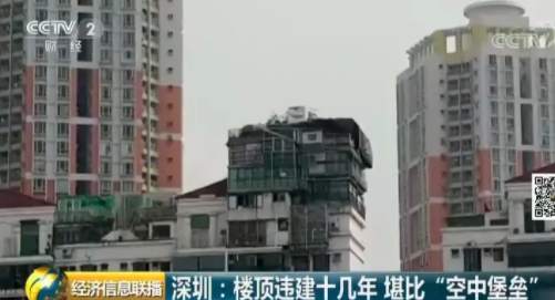 深圳福田區(qū)一個(gè)小區(qū)的居民日前爆料稱,小區(qū)一位業(yè)主違規(guī)在天臺(tái)上加建了幾層樓,遠(yuǎn)遠(yuǎn)看去就像一個(gè)“空中堡壘”,曾經(jīng)有人差點(diǎn)被上面掉落的鋼筋砸中,如此醒目的違建,已經(jīng)存在了十幾年。