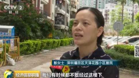 深圳福田區(qū)天澤花園小區(qū)居民彭女士:我們有時(shí)候都不敢經(jīng)過(guò)這樓下,萬(wàn)一被上面的鋼管砸到,估計(jì)都沒(méi)命了。