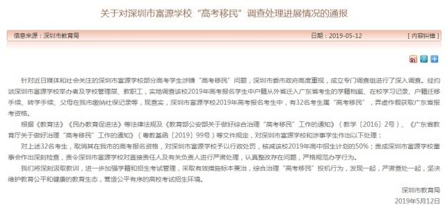 5月12日晚,深圳市教育局發(fā)布《關(guān)于對深圳市富源學(xué)校“高考移民”調(diào)查處理進展情況的通報》,通報稱,經(jīng)查實,深圳市富源學(xué)校2019年高考報名考生中,有32名考生屬“高考移民”,弄虛作假獲取廣東省報考資格。按照相關(guān)法例,對涉事32名學(xué)生取消在深圳市的高考報名資格,對深圳市富源學(xué)校予以行政處罰,核減該校2019年高中招生計劃的50%;責成深圳市富源學(xué)校董事會作出深刻檢查,責令深圳市富源學(xué)校對直接責任人及有關(guān)負責人進行嚴肅處理,認真整改存在問題,嚴格規(guī)范辦學(xué)行為。