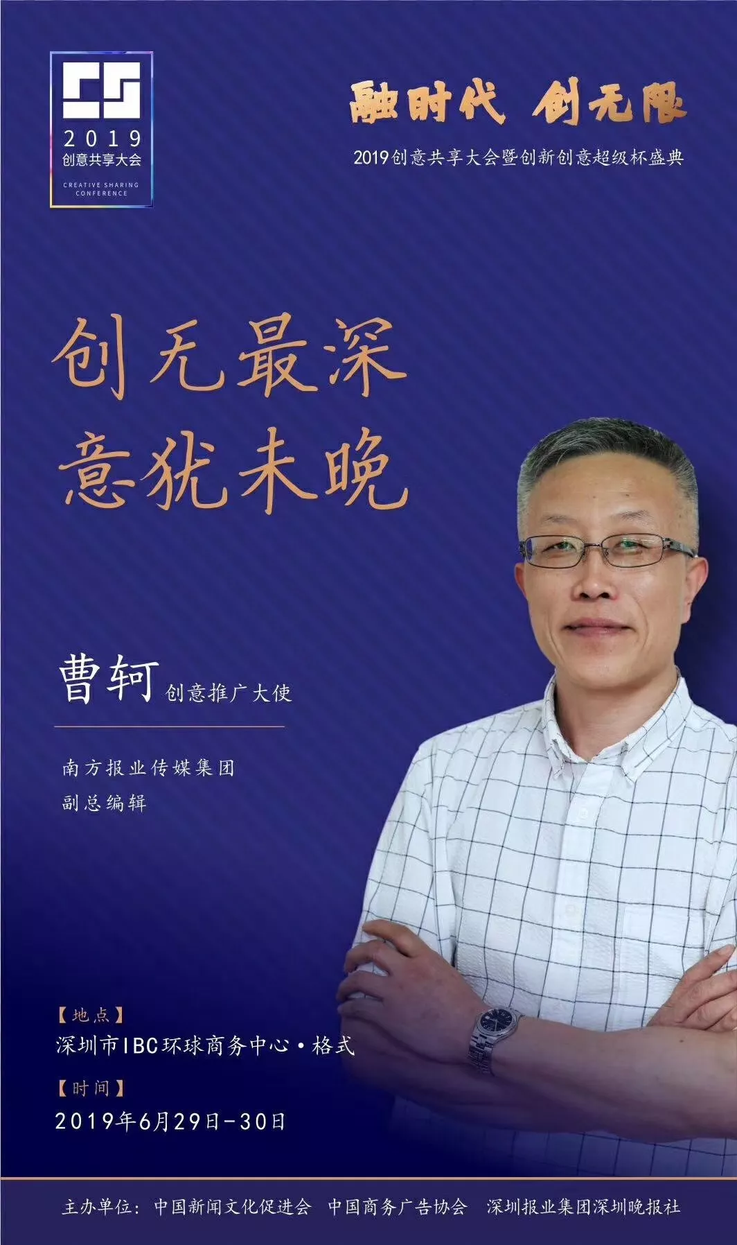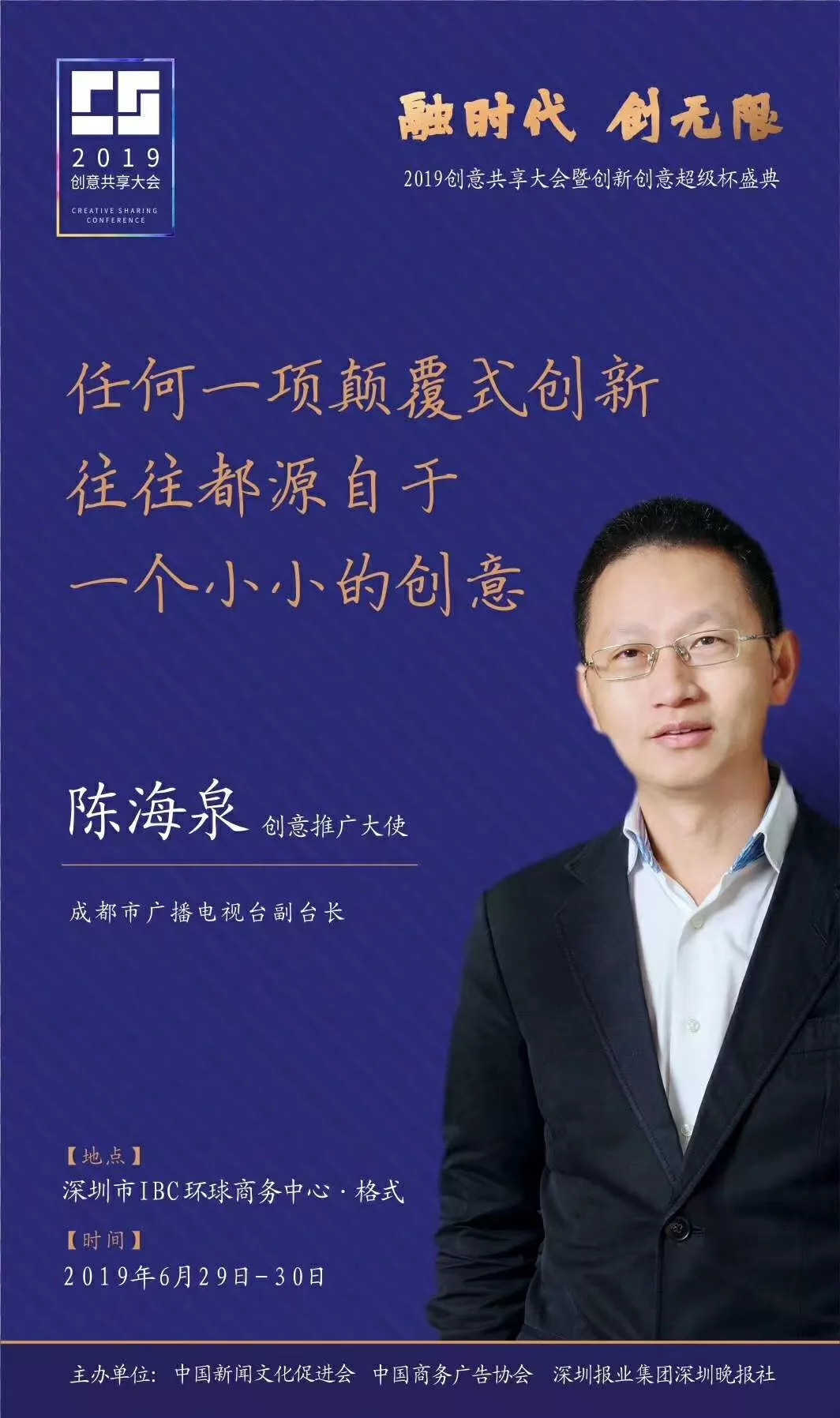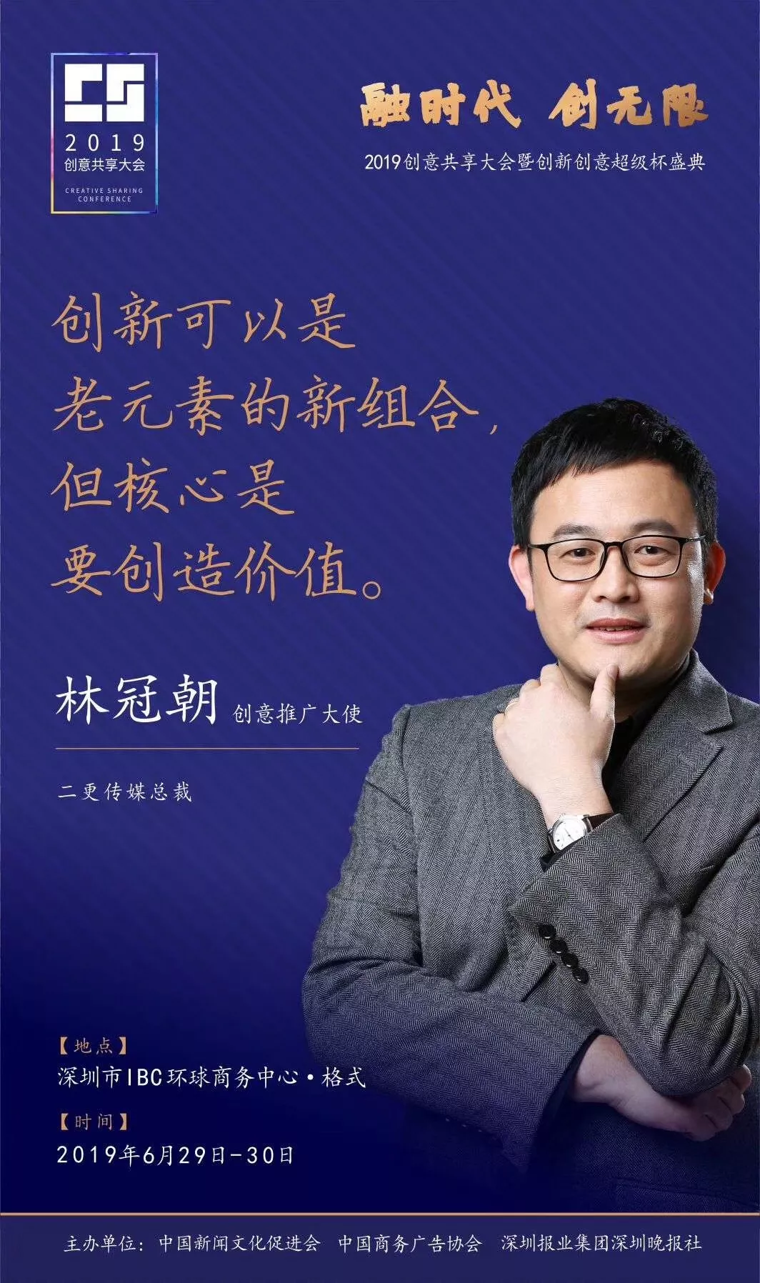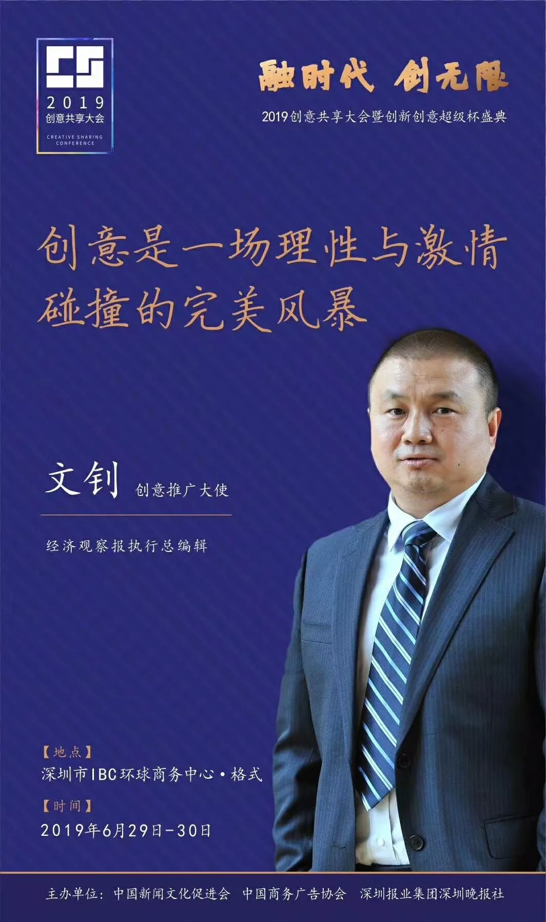 為了展現(xiàn)創(chuàng)意中國的精神風(fēng)貌和創(chuàng)意傳媒的文化力量,構(gòu)建創(chuàng)新創(chuàng)意共同體,擘畫美好圖景和未來趨勢,2019年6月29日至30日,由中國新聞文化促進(jìn)會、中國商務(wù)廣告協(xié)會、深圳報業(yè)集團(tuán)深圳晚報社等聯(lián)合主辦的“融時代創(chuàng)無限——2019創(chuàng)意共享大會暨創(chuàng)新創(chuàng)意超級杯盛典”將在深圳市IBC環(huán)球商務(wù)中心隆重舉辦。