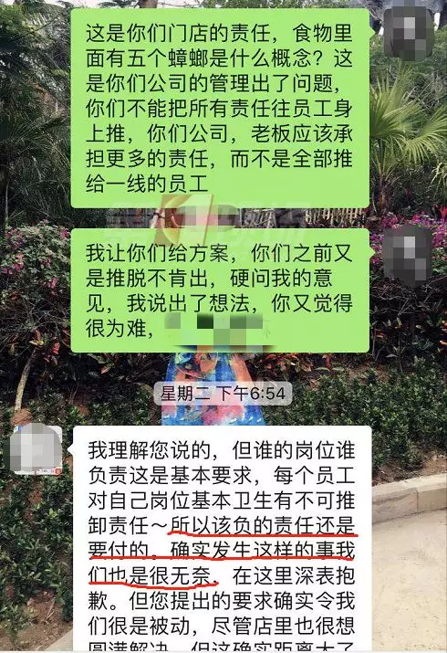 康先生拍了現(xiàn)場(chǎng)的照片,因?yàn)楦糁w,可以看到有多個(gè)小黑點(diǎn),但很難一眼辨認(rèn)出是小蟑螂。不過(guò),從康先生提供的微信聊天記錄可以看出,店方承認(rèn)他們員工有疏忽,也派負(fù)責(zé)人跟康先生溝通賠償問(wèn)題。康先生表示店家愿意賠償1000元,但他感覺(jué)對(duì)自己的精神影響很大,并不同意。