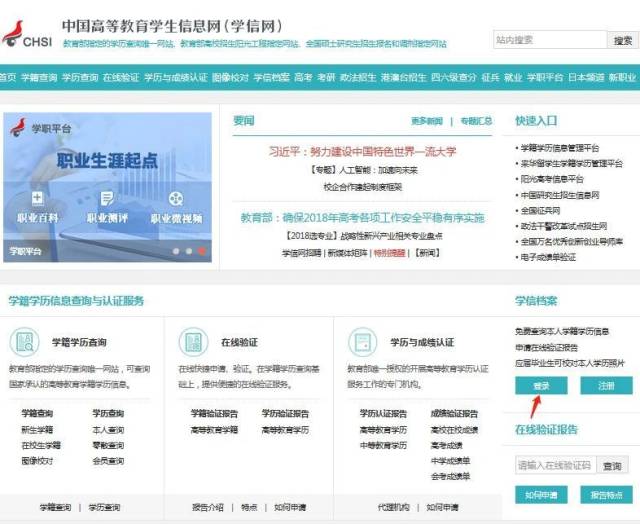 進(jìn)入學(xué)信網(wǎng)網(wǎng)址:http://www.chsi.com.cn/,打開之后點擊下圖提示的地方