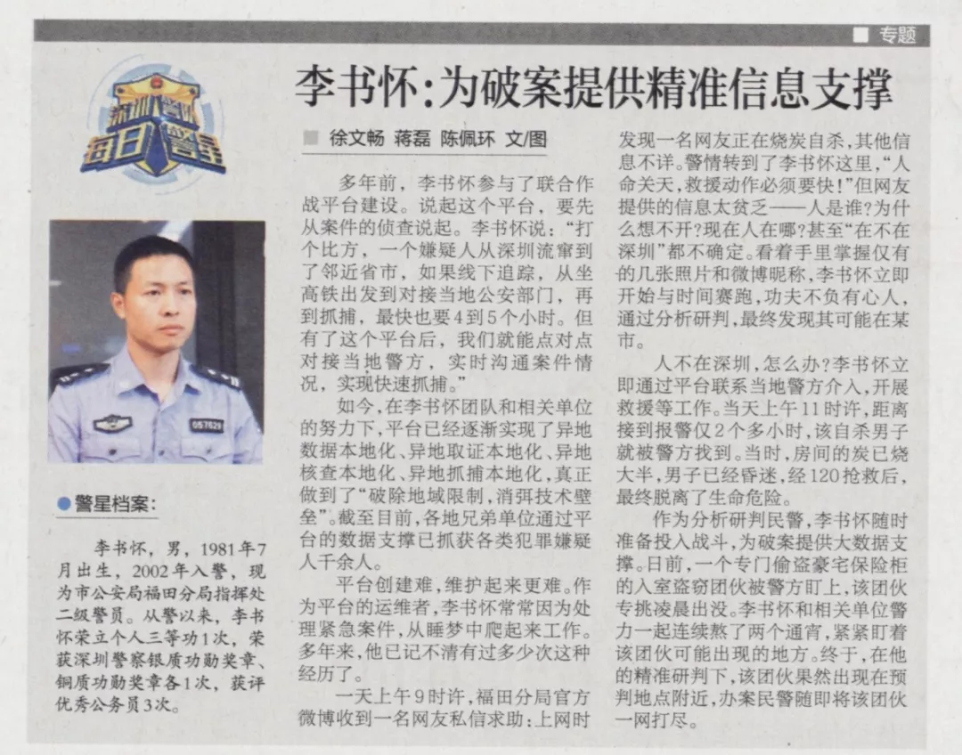 一天上午9時(shí)許,福田分局官方微博收到一名網(wǎng)友私信求助:上網(wǎng)時(shí)發(fā)現(xiàn)一名網(wǎng)友正在燒炭自殺,其他信息不詳。警情轉(zhuǎn)到了李書懷這里,“人命關(guān)天,救援動(dòng)作必須要快!”但網(wǎng)友提供的信息太貧乏——人是誰(shuí)?為什么想不開?現(xiàn)在人在哪?甚至“在不在深圳”都不確定。看著手里掌握僅有的幾張照片和微博昵稱,李書懷立即開始與時(shí)間賽跑,功夫不負(fù)有心人,通過(guò)分析研判,最終發(fā)現(xiàn)其可能在某市。