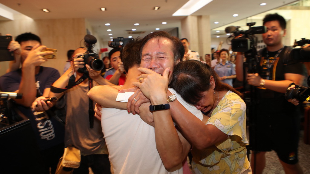 7、7月18日上午,在深圳市公安局刑事偵查局和福田分局的幫助下,尋子18年的余氏夫婦在深圳市刑偵局技術(shù)處一樓見到了兒子,團(tuán)聚現(xiàn)場(chǎng)余氏夫婦將兒子緊摟懷中,淚流滿面。