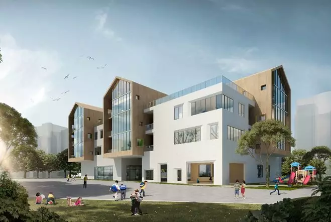 建筑造型簡(jiǎn)潔現(xiàn)代,在白色體量上嵌入三個(gè)木色坡屋頂體塊,如積木城堡一般,富有童趣,建筑設(shè)有集中活動(dòng)平臺(tái)作為補(bǔ)充。