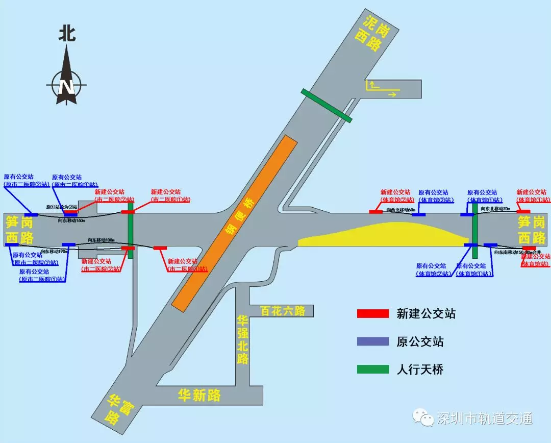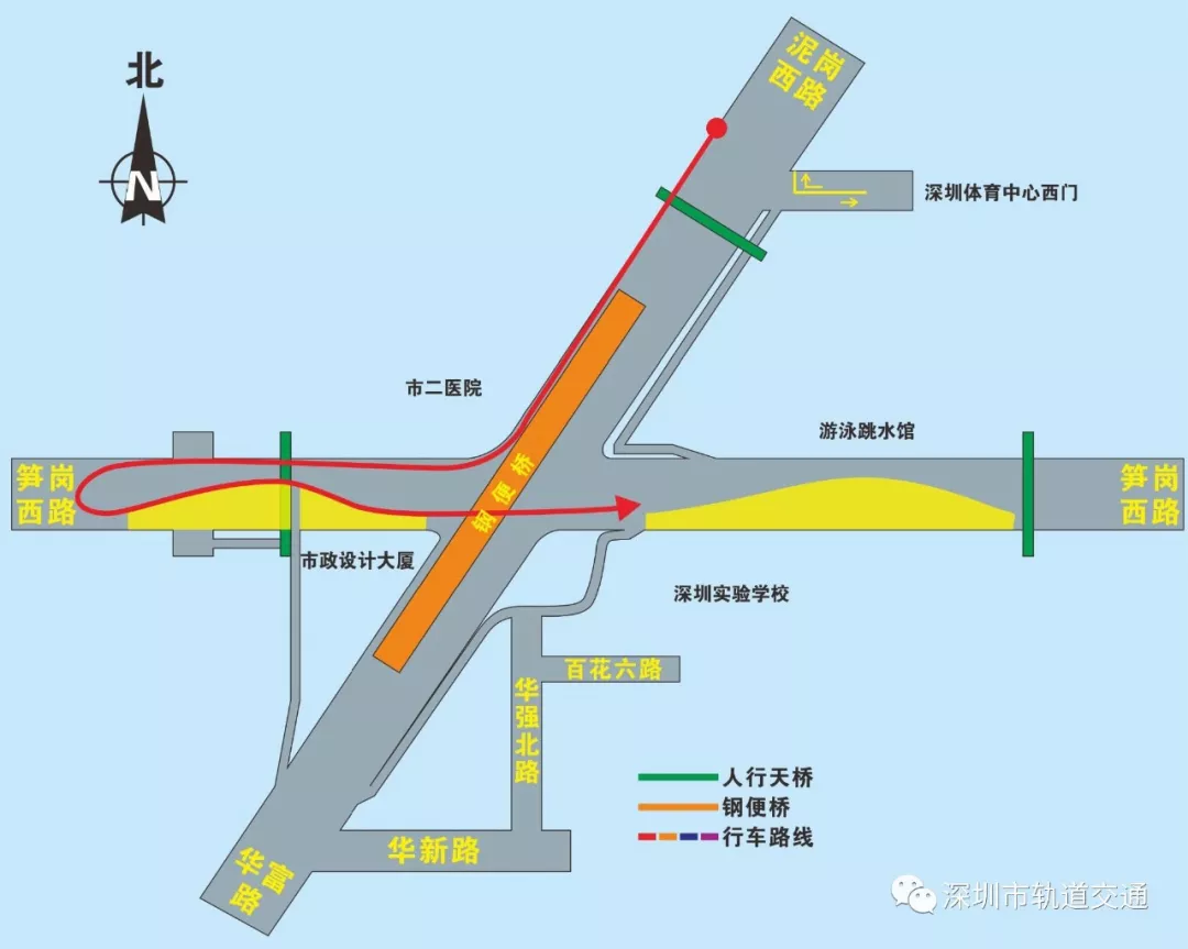 在本次調(diào)整中,華富路-泥崗西路南北向交通只能通過鋼便橋雙向六車道行車。泥崗西路、華富路、筍崗西路左轉(zhuǎn),行人線路及“市二醫(yī)院”,“體育館”公交站臺均有所調(diào)整。