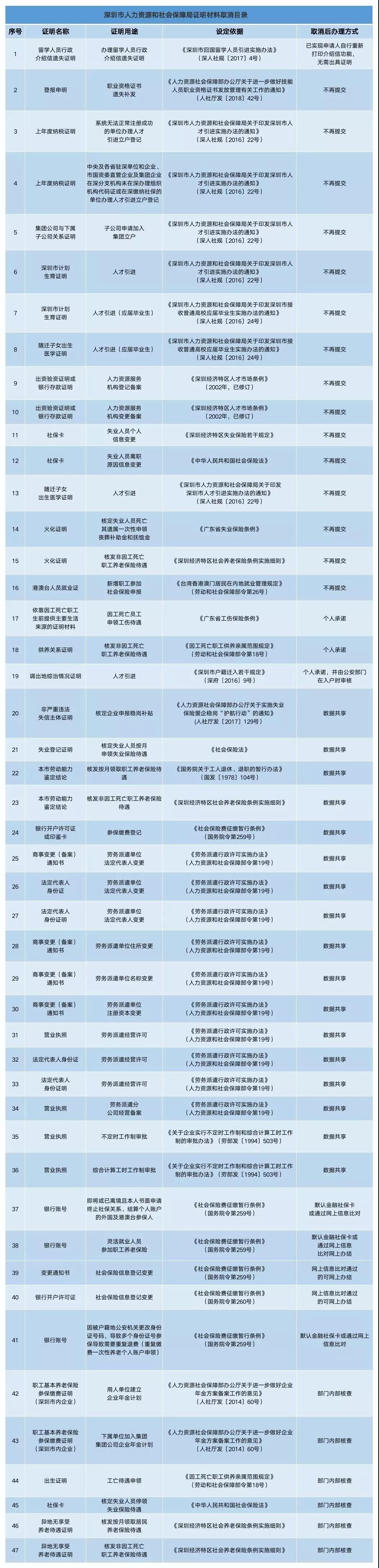 記者梳理發(fā)現(xiàn),這47項證明材料包括:新增職工參加社會保險申報,港澳臺人員就業(yè)證不用再提交;人才引進(jìn)(應(yīng)屆畢業(yè)生),深圳市計劃生育證明、隨遷子女出生醫(yī)學(xué)證明無需再提交;勞務(wù)派遣單位法定代表人變更,法定代表人身份證、商事變更(備案)通知書等。