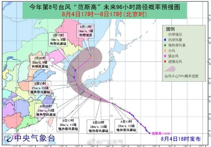今年第8號(hào)臺(tái)風(fēng)"范斯高"(強(qiáng)熱帶風(fēng)暴級(jí))的中心4日17時(shí)位于日本鹿兒島東偏南方約1020公里的西北太平洋洋面上,中心附近最大風(fēng)力10級(jí)(25米 /秒),中心最低氣壓為985百帕,七級(jí)風(fēng)圈半徑150-300公里。