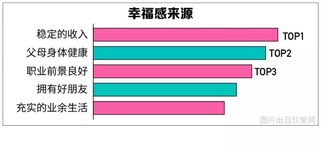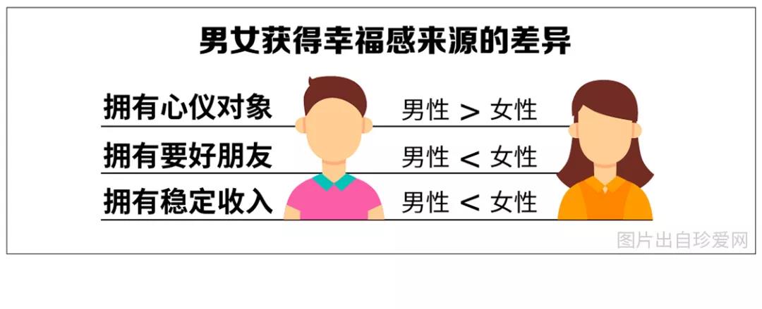 深入研究發(fā)現(xiàn),男性對“擁有心儀對象”的需求比例(6.67%)略高于女性(3.17%),女性則是在擁有要好朋友的比例(28.79%)上高于男性(6.67%),且因?yàn)榉€(wěn)定收入感到幸福的女性比例(60%)比男性(53%)更高??梢?,女性更容易從穩(wěn)定的收入中獲得幸福感。