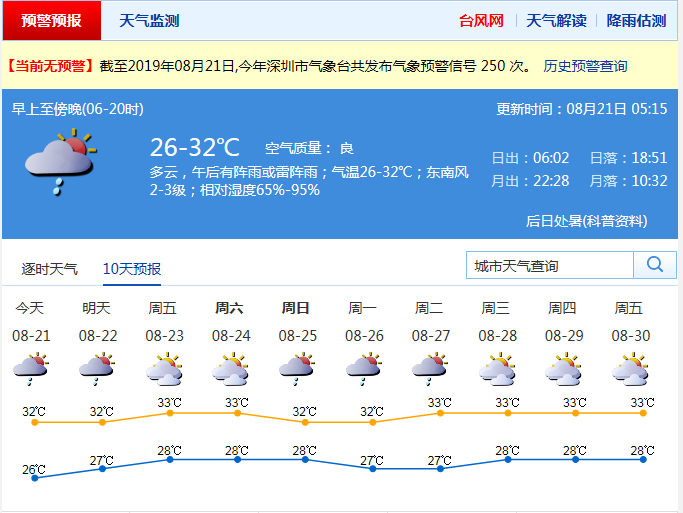 見圳客戶端·深圳新聞網(wǎng)2019年8月21日訊(見圳客戶端·深圳新聞網(wǎng)記者 高暢韻)記者從市氣象局了解到,昨日我市白天最高氣溫31 ℃ -33 ℃,中北部最高氣溫達到35 ℃。今日多云,有(雷)陣雨;22-24日多云間晴天,局部有短時(雷)陣雨,部分地區(qū)最高氣溫可達35 ℃左右;25-26日有(雷)陣雨,氣溫有所回落。