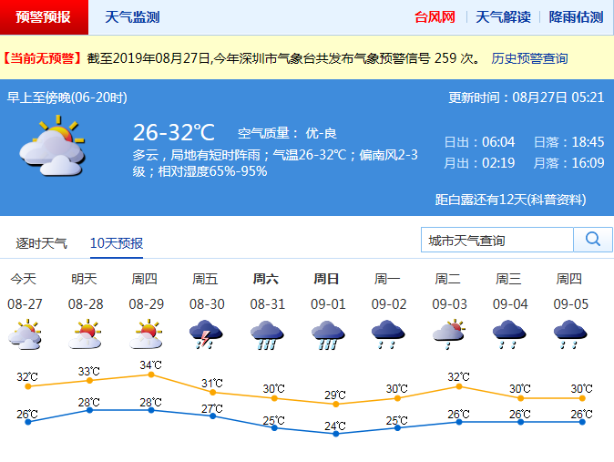 今天白天,全市陣雨轉(zhuǎn)多云天氣。最低氣溫26℃,最高氣溫32℃。市內(nèi)維持2-3級(jí)偏南風(fēng)。相對(duì)濕度65%-95%。