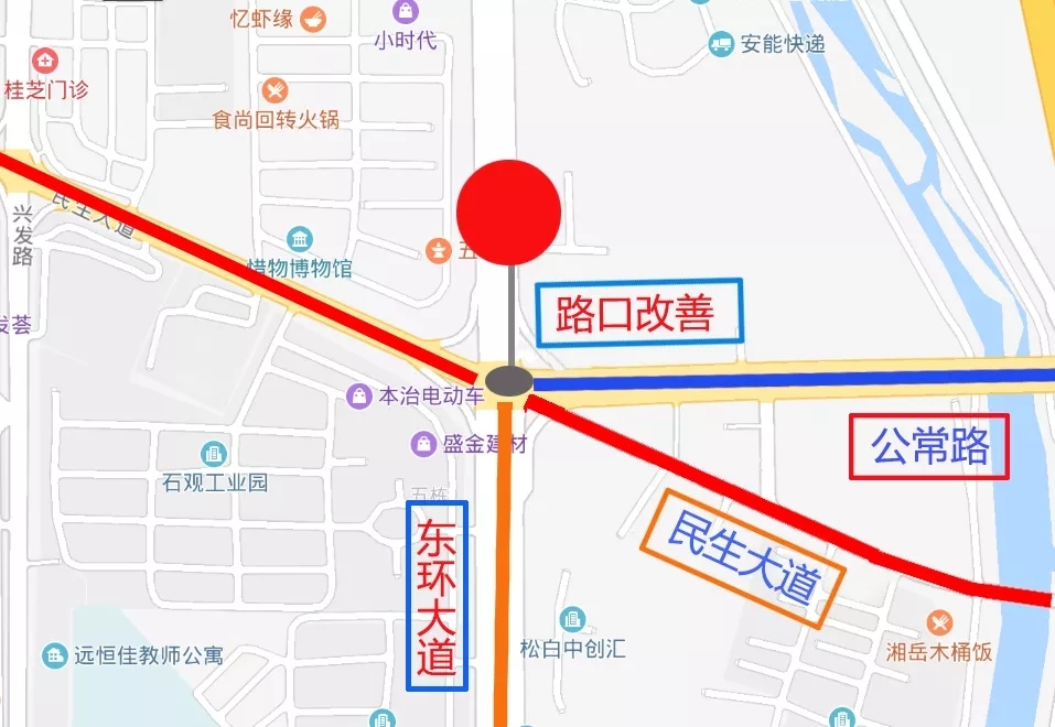 ▼改造前:東環(huán)大道、公常路皆為光明區(qū)主干道,車流量大,但車道狹窄,路口擁堵,存在極大的安全隱患。此外,該路口人車混行,非機(jī)動(dòng)車逆行現(xiàn)象嚴(yán)重,中間岔口僅用石墩圍擋,安全隱患突出。