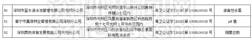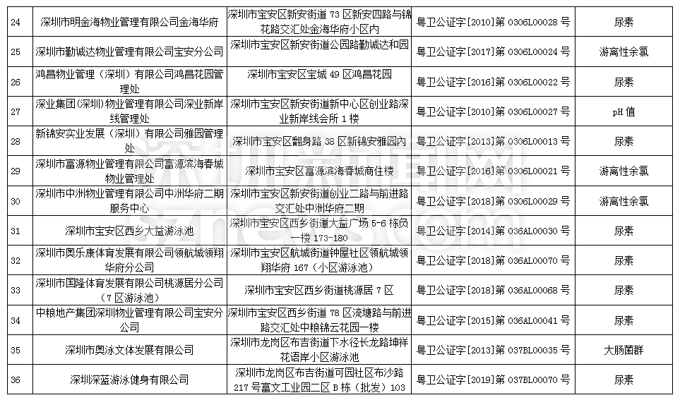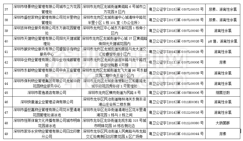此次檢查結(jié)果顯示,深圳明門偉健體育服務(wù)有限公司(游泳池)、深圳市綠景物業(yè)管理有限公司城市立方花園管理處(游泳池)、深圳市盛世家物業(yè)管理有限公司花半里物業(yè)管理處(游泳池)尿素、游離性余氯兩項(xiàng)檢測(cè)指標(biāo)不合格,深圳市力美健華聯(lián)健身有限公司(游泳池)pH值、尿素兩項(xiàng)檢測(cè)指標(biāo)不合格,錦龍?bào)w育文化發(fā)展(深圳)有限公司(游泳池)、深圳市安居樂業(yè)物業(yè)管理有限公司(游泳池)、深圳市天健物業(yè)管理有限公司陽(yáng)光天健城管理處(游泳池)pH值、游離性余氯兩項(xiàng)檢測(cè)指標(biāo)不合格,此外,有45家游泳場(chǎng)所分別因pH值、尿素、游離性余氯、細(xì)菌總數(shù)以及大腸菌群等指標(biāo)不合格被予以通告。衛(wèi)生監(jiān)督部門已責(zé)令抽檢結(jié)果不合格單位立即整改。