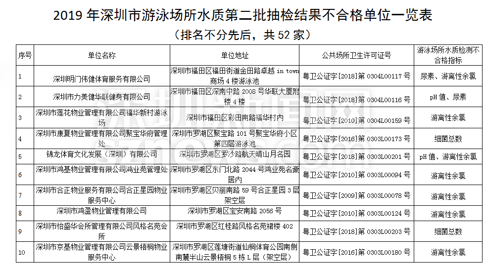 見圳客戶端·深圳新聞網(wǎng)2019年8月29日訊(見圳客戶端、深圳新聞網(wǎng)記者 劉夢(mèng)婷 通訊員 深衛(wèi)監(jiān))深圳市衛(wèi)生健康委近期組織了各級(jí)衛(wèi)生監(jiān)督機(jī)構(gòu)對(duì)全市游泳場(chǎng)所水質(zhì)進(jìn)行了分批專項(xiàng)抽樣檢驗(yàn),并在近日公布了2019年第二批游泳場(chǎng)所水質(zhì)抽檢結(jié)果。第二批共抽檢游泳場(chǎng)所451家,檢測(cè)指標(biāo)為游離性余氯、渾濁度、尿素、pH值、細(xì)菌總數(shù)、大腸菌群等六項(xiàng)。抽檢的451家游泳場(chǎng)所中,合格399家,合格率為88.47%,不合格52家,不合格率為11.53%;不合格指標(biāo)主要為游離性余氯、尿素、細(xì)菌總數(shù)、pH值和大腸菌群。