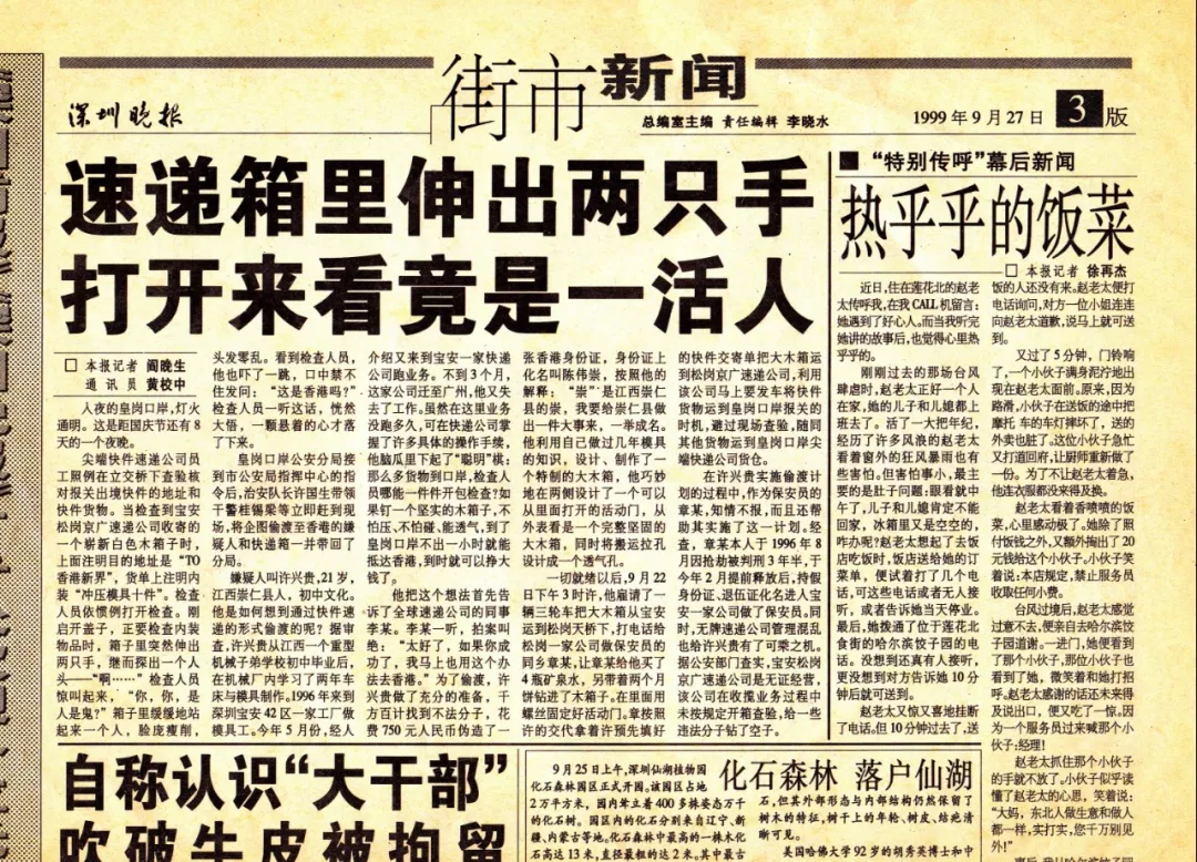 而歷史賦予這支鐵軍的特殊使命任務(wù)則是重拳打擊口岸走私和偷渡犯罪。皇崗口岸派出所老職工桂錫梁至今還珍藏著一份些許泛黃的舊報(bào)紙,一篇名為“速遞箱里伸出兩只手,打開來(lái)看竟是一活人”的報(bào)道記錄了1999年9月22日曾發(fā)生的一起偷渡案件。作為當(dāng)時(shí)參與處置的一員,桂錫梁回憶道,犯罪分子將自己裝進(jìn)一個(gè)特制的大木箱中,偽裝成裝有“沖壓模具”發(fā)往香港的快遞箱,計(jì)劃偷渡出境,最終在位于皇崗口岸附近的快遞轉(zhuǎn)運(yùn)點(diǎn)被警方查獲。