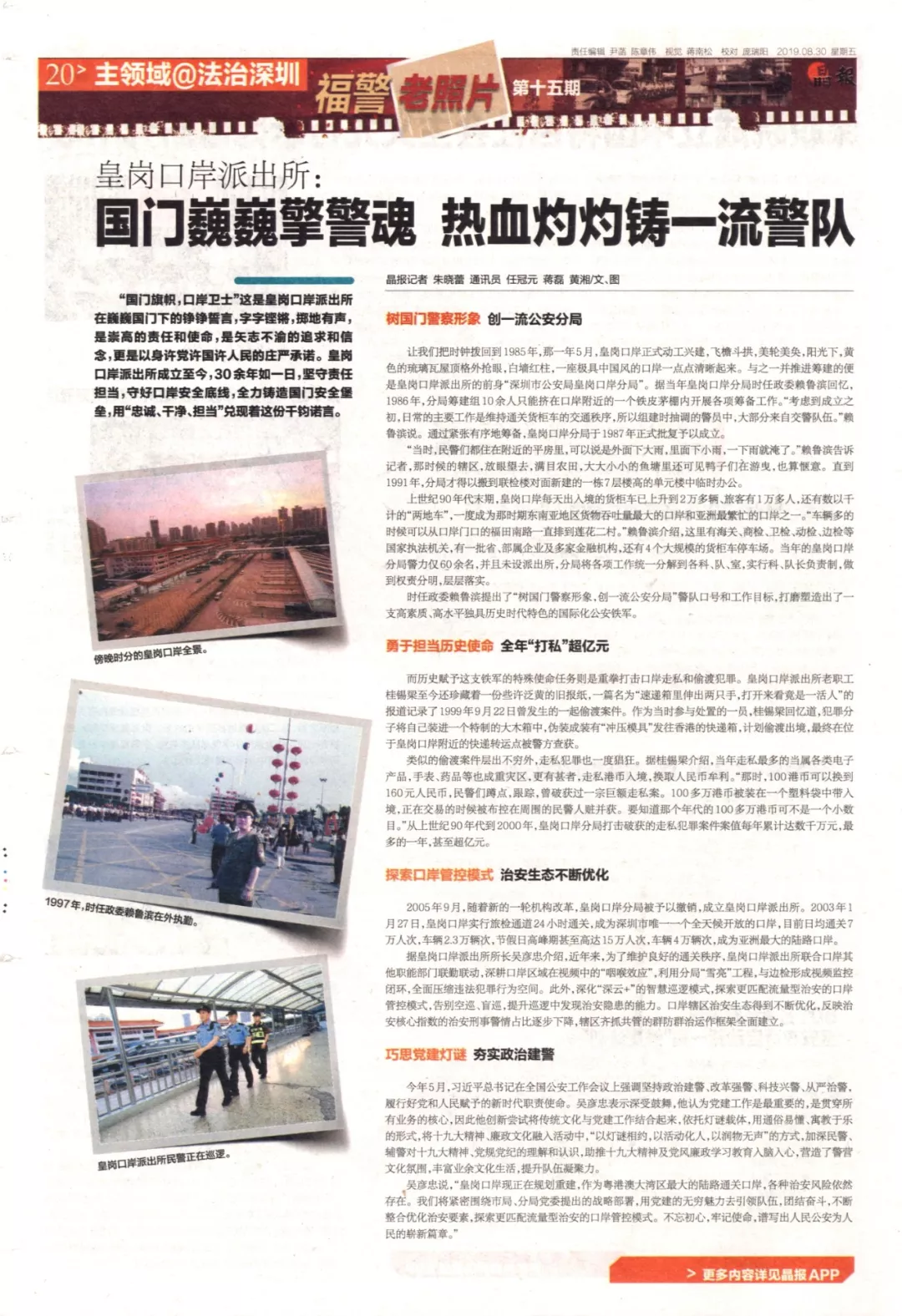 讓我們把時(shí)鐘撥回到1985年,那一年5月,皇崗口岸正式動(dòng)工興建,飛檐斗拱,美輪美奐,陽(yáng)光下,黃色的琉璃瓦屋頂格外搶眼,白墻紅柱,一座極具中國(guó)風(fēng)的口岸一點(diǎn)點(diǎn)清晰起來(lái)。與之一并推進(jìn)籌建的便是皇崗口岸派出所的前身“深圳市公安局皇崗口岸分局”。據(jù)當(dāng)年皇崗口岸分局時(shí)任政委賴魯濱回憶,1986年,分局籌建組10余人只能擠在口岸附近的一個(gè)鐵皮茅棚內(nèi)開展各項(xiàng)籌備工作。“考慮到成立之初,日常的主要工作是維持通關(guān)貨柜車的交通秩序,所以組建時(shí)抽調(diào)的警員中,大部分來(lái)自交警隊(duì)伍?!辟圁敒I說。通過緊張有序地籌備,皇崗口岸分局于1987年正式批復(fù)予以成立。