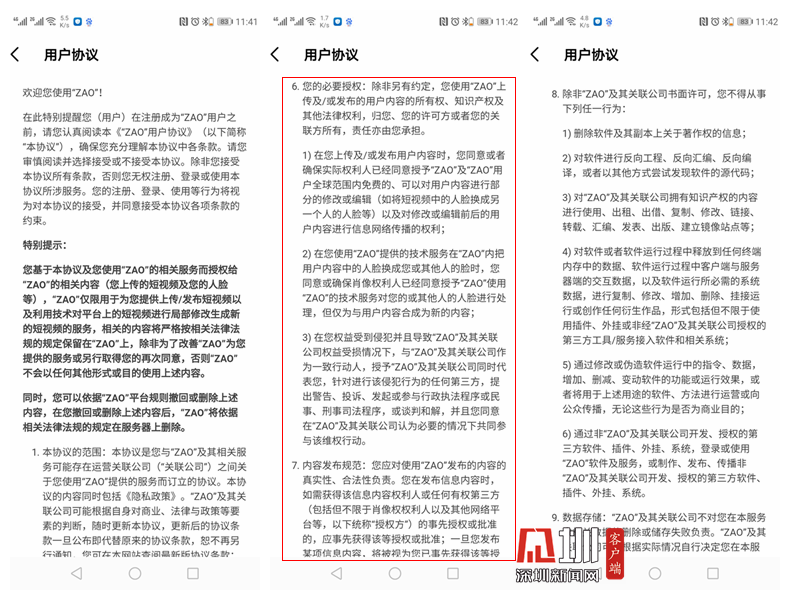 見(jiàn)圳客戶端.深圳新聞網(wǎng)2019年9月3日訊(見(jiàn)圳客戶端、深圳新聞網(wǎng)記者 張玲)從一夜爆紅,到爭(zhēng)議不斷,AI換臉APP“ZAO”三天內(nèi)體會(huì)到“過(guò)山車”般的口碑暴跌——由于其面部識(shí)別功能,及其《用戶協(xié)議》(簡(jiǎn)稱“協(xié)議”)引起了網(wǎng)絡(luò)上的激烈討論。有人擔(dān)憂“ZAO”借此軟件搜集用戶面部識(shí)別信息向第三方銷售牟取暴利。