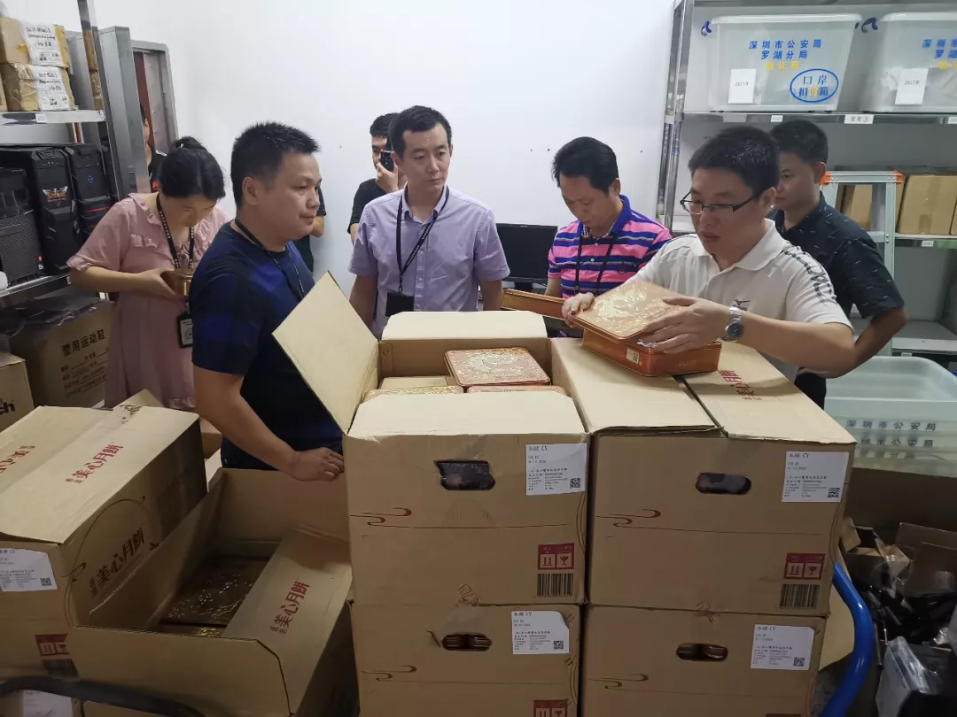執(zhí)法人員聯(lián)合公安機(jī)關(guān)、商標(biāo)權(quán)利人對涉嫌假冒月餅進(jìn)行鑒定