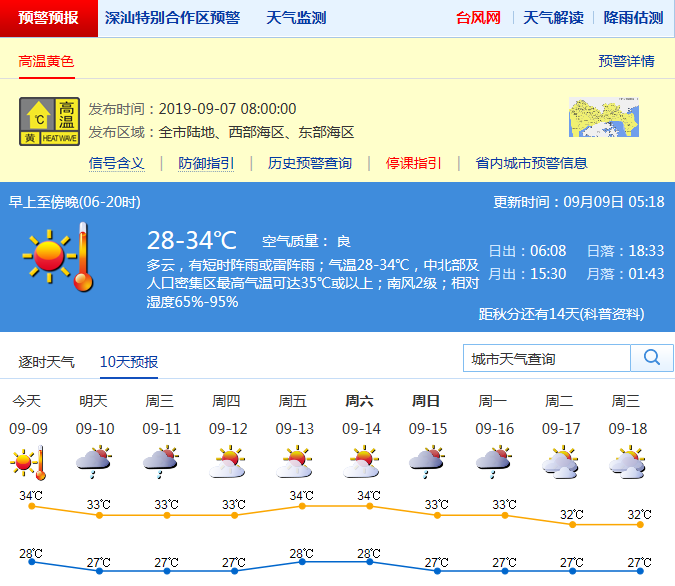 見圳客戶端·深圳新聞網(wǎng)2019年9月9日訊 深圳市氣象局官方微博消息,這周天氣炎熱伴有雷陣雨:周一多云,有短時(shí)雷陣雨,氣溫28-34℃;周二到周三日多云,有(雷)陣雨;周四到周六天氣晴熱,午后有熱雷雨。高溫黃色預(yù)警信號生效中,請注意防暑降溫及午后熱雷雨。