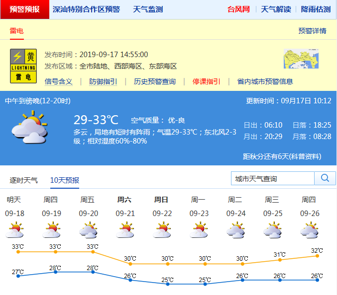 深圳市氣象臺于9月17日14時55分在全市發(fā)布雷電預(yù)警,預(yù)計60分鐘內(nèi)全市將受雷電影響,按照防御預(yù)案停止戶外易燃易爆危險作業(yè),并加強?;瘓鏊踩芾?。