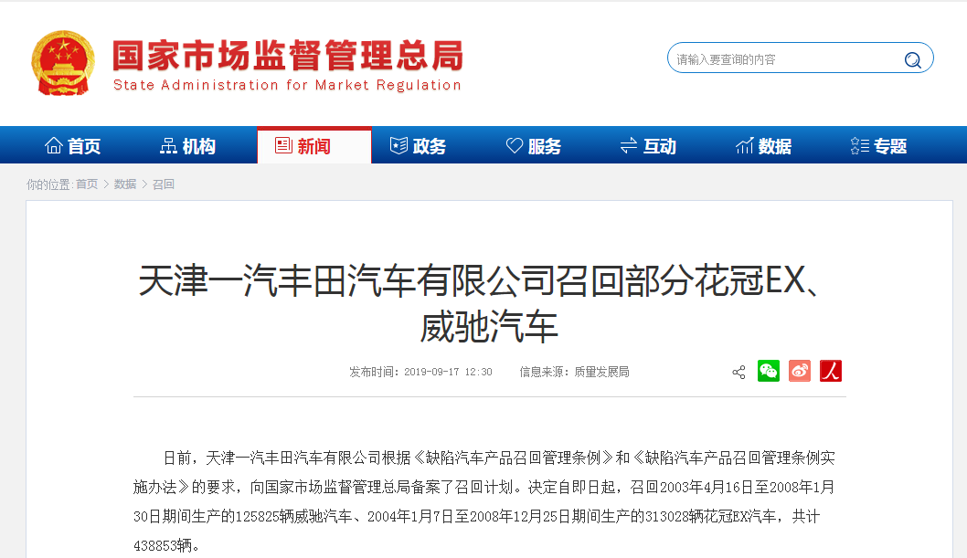 日前,天津一汽豐田汽車(chē)有限公司根據(jù)《缺陷汽車(chē)產(chǎn)品召回管理?xiàng)l例》和《缺陷汽車(chē)產(chǎn)品召回管理?xiàng)l例實(shí)施辦法》的要求,向國(guó)家市場(chǎng)監(jiān)督管理總局備案了召回計(jì)劃。決定自即日起,召回2003年4月16日至2008年1月30日期間生產(chǎn)的125825輛威馳汽車(chē)、2004年1月7日至2008年12月25日期間生產(chǎn)的313028輛花冠EX汽車(chē),共計(jì)438853輛。