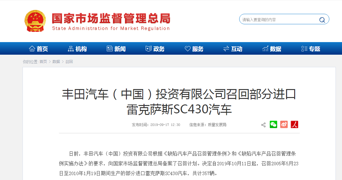 日前,豐田汽車(chē)(中國(guó))投資有限公司根據(jù)《缺陷汽車(chē)產(chǎn)品召回管理?xiàng)l例》和《缺陷汽車(chē)產(chǎn)品召回管理?xiàng)l例實(shí)施辦法》的要求,向國(guó)家市場(chǎng)監(jiān)督管理總局備案了召回計(jì)劃。決定自2019年10月11日起,召回2005年5月23日至2010年1月19日期間生產(chǎn)的部分進(jìn)口雷克薩斯SC430汽車(chē),共計(jì)357輛。