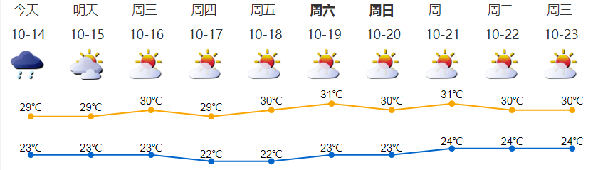 多云,有陣雨;氣溫23-29℃;東北風(fēng)2-3級(jí),沿海、高地和海區(qū)最大陣風(fēng)5-6級(jí);相對(duì)濕度65%-95%。