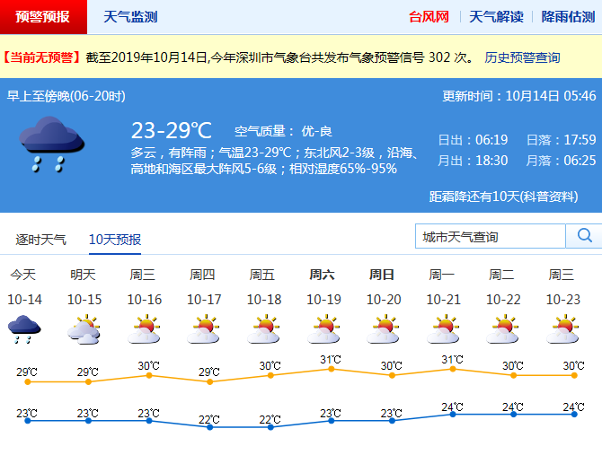 見圳客戶端·深圳新聞網2019年10月14日訊 受冷空氣影響,昨日凌晨至上午深圳普降大雨,局部暴雨,并伴有雷暴和7級左右短時大風。預計本周前期風力清勁有陣雨,中后期晴好干燥。其中,周一有陣雨,高地、沿海和海區(qū)陣風6-7級,早晚較涼,氣溫23-29℃;周二漸轉多云,陣風7-8級;周三至周日晴天干燥。