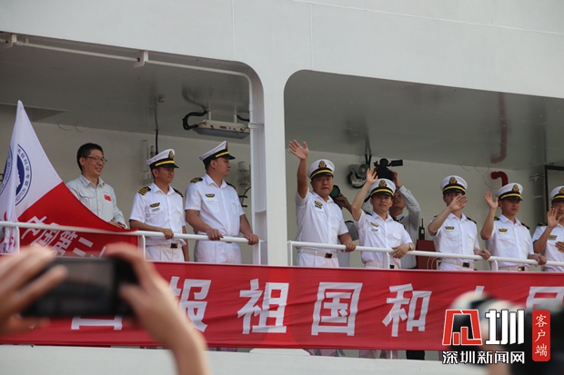 雪龍2號上的船員和科考隊員向岸上的送別人群揮手告別,“感謝祖國、感謝深圳!”
