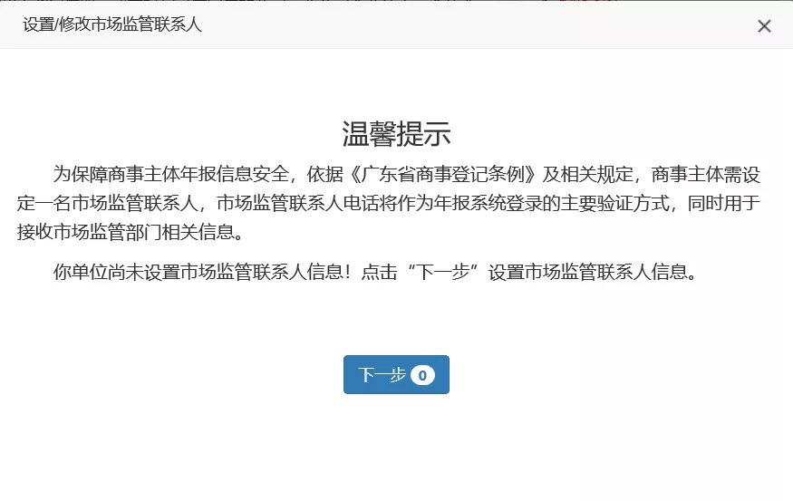 第二步:系統(tǒng)自動(dòng)彈出市場(chǎng)監(jiān)管聯(lián)系人設(shè)置提示框,閱讀完成后點(diǎn)擊“下一步”。