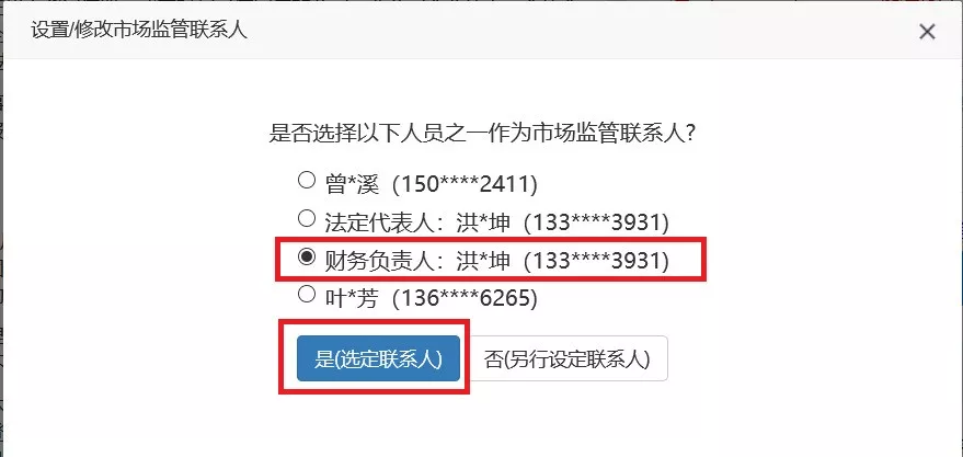 第三步:彈出備選的市場(chǎng)監(jiān)管聯(lián)系人信息,選擇一名,點(diǎn)擊“是(選定聯(lián)系人)”。