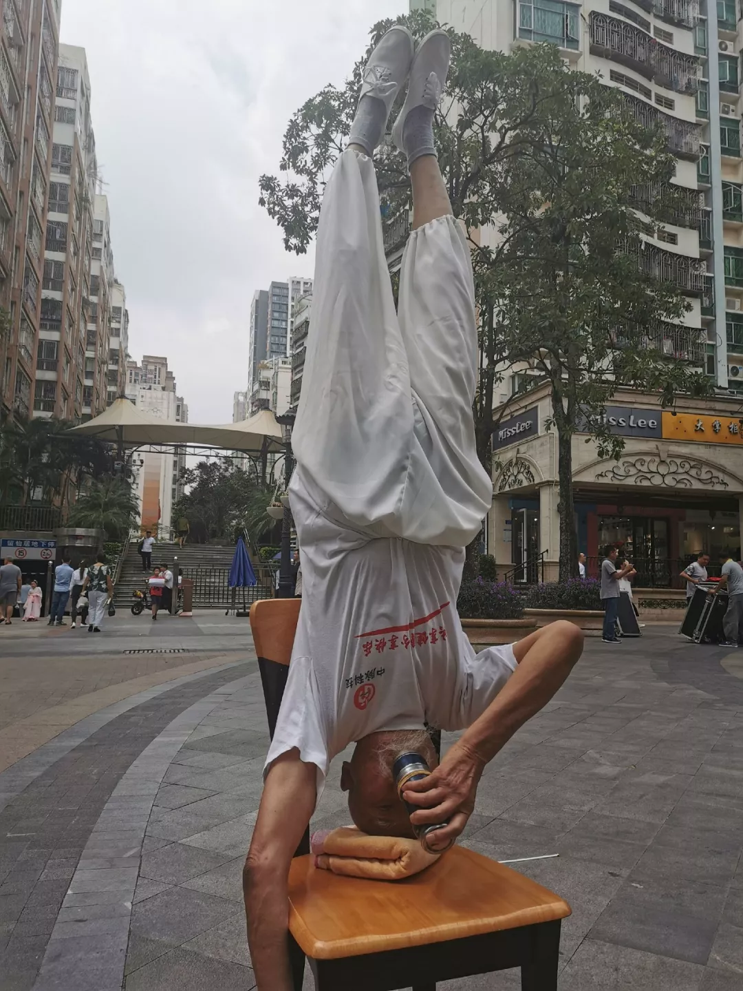 蛇口消息報2019年11月4日訊 頭著板凳倒立、雙手寫字、倒立喝水、倒立吊環(huán),倒立唱歌……做這些高難度動作的人居然是一位85歲高齡的老人。