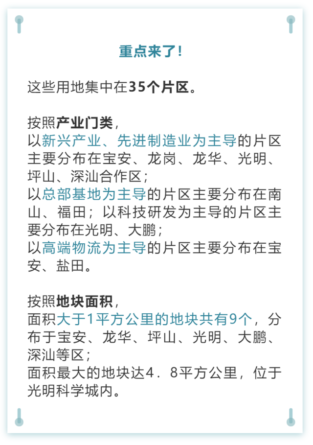 本次推出的30平方公里產(chǎn)業(yè)用地,將重點(diǎn)布局重大創(chuàng)新載體、新興產(chǎn)業(yè)集群和產(chǎn)業(yè)鏈重點(diǎn)領(lǐng)域關(guān)鍵環(huán)節(jié)等三大方向,對(duì)于深圳率先建設(shè)體現(xiàn)高質(zhì)量發(fā)展要求的現(xiàn)代化經(jīng)濟(jì)體系發(fā)揮關(guān)鍵性支撐作用。