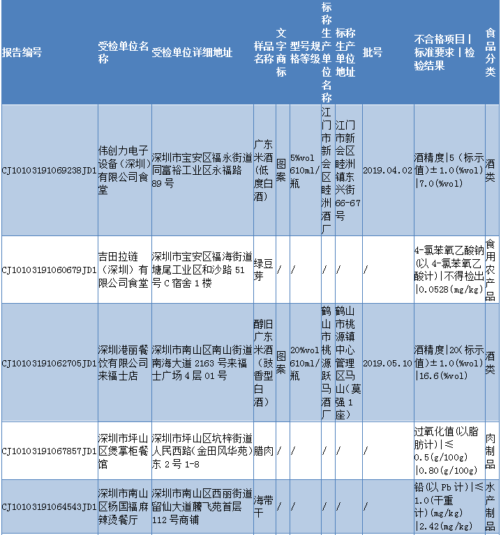 見圳客戶端 ·深圳新聞網(wǎng)2019年11月6日訊 11月5日,深圳市市場監(jiān)督管理局發(fā)布2019年第四十期食品安全抽樣檢驗(yàn)情況通報(bào),通報(bào)稱,深圳市市場監(jiān)督管理局于2019年8-9月組織對(duì)我市餐飲環(huán)節(jié)的食品開展了抽樣檢驗(yàn)工作,本次共抽檢餐飲環(huán)節(jié)食品671批次,涉及餐飲環(huán)節(jié)經(jīng)營主體584家次,共檢測食品指標(biāo)3385項(xiàng)次。其中檢出不合格樣品12批次,涉及不合格食品類別有酒類2批次均為米酒;肉制品2批次為臘肉和臘鴨腿;食糖1批次、食用農(nóng)產(chǎn)品5批次牛蛙、豬肝等在列;蔬菜制品1批次、水產(chǎn)制品1批次。