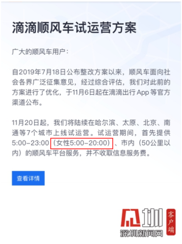 面對(duì)爭(zhēng)議,滴滴調(diào)整了:對(duì)所有順風(fēng)車用戶提供服務(wù)的時(shí)間均改為5:00-20:00