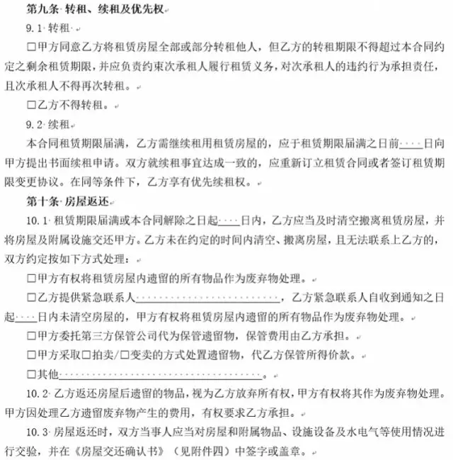 4、增設(shè)承租人下落不明時,出租人對租賃房屋內(nèi)的遺留物處理條款。實踐中,存在很多承租人無力支付租金時斷絕與出租人聯(lián)系的情形。為解決出租人無法聯(lián)系承租人時對租賃房屋內(nèi)遺留物的處理問題,新版合同增設(shè)承租人未按約定交還房屋且下落不明時遺留物的處理條款,由雙方當(dāng)事人在簽訂合同時就此問題協(xié)商一致,避免出租人遭受無法收回房屋導(dǎo)致房屋使用價值無法實現(xiàn)的損失或者因自行處置遺留物引起糾紛、面臨侵權(quán)責(zé)任的風(fēng)險,有效解決承租人下落不明時租賃房屋內(nèi)遺留物的處理問題。